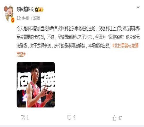 球圈赵探长报道表示:“今天是陈国豪加盟广州后,首次回到老东家北控的主场,没想到赶上对双方赛季都至关重要的卡位战。不过尽管国豪随队来到北京,但因为‘回避条款’,他今晚无法登场。对于广州来说,庆幸的是李翔波解禁,本场能够出战。”