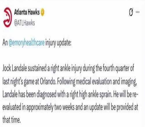 北京时间4月3日,老鹰队官方发布声明称,中锋兰代尔被确诊为右脚踝高位扭伤,将在大约两周后接受复查。