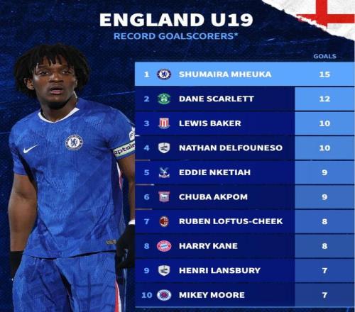 德转列英格兰U19代表队历史射手榜:切尔西小将姆厄卡15球第1